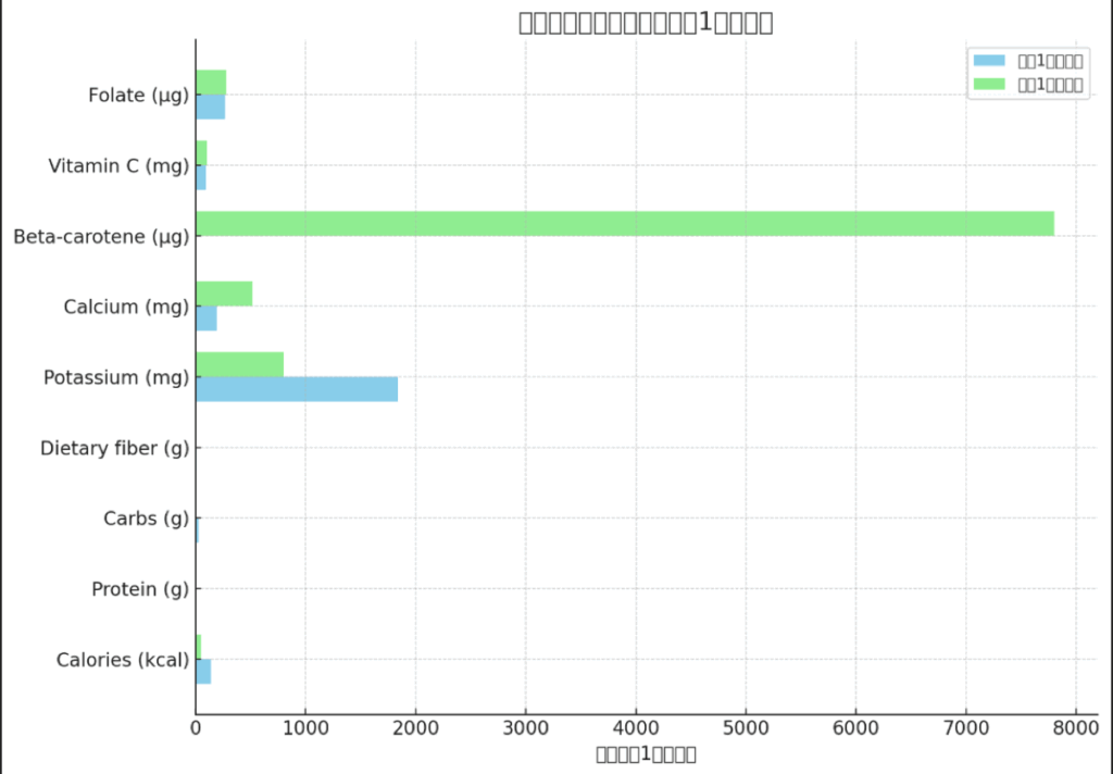 大根の葉にはβ-カロテン・カリウム・カルシウムが非常に多いのが、よく分かるグラフになっているはず。