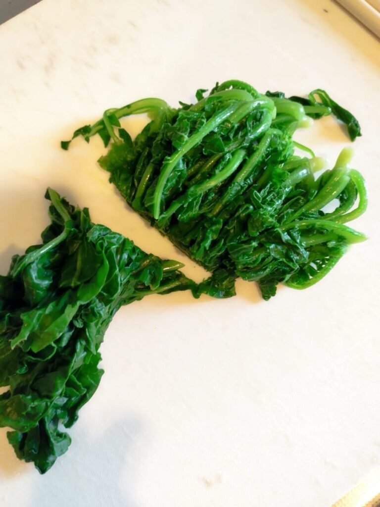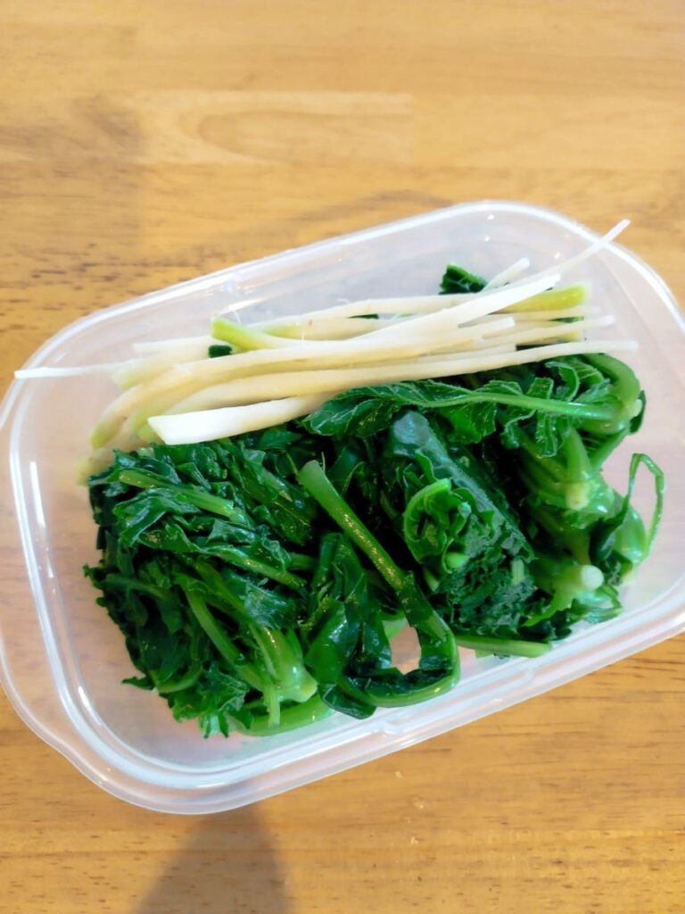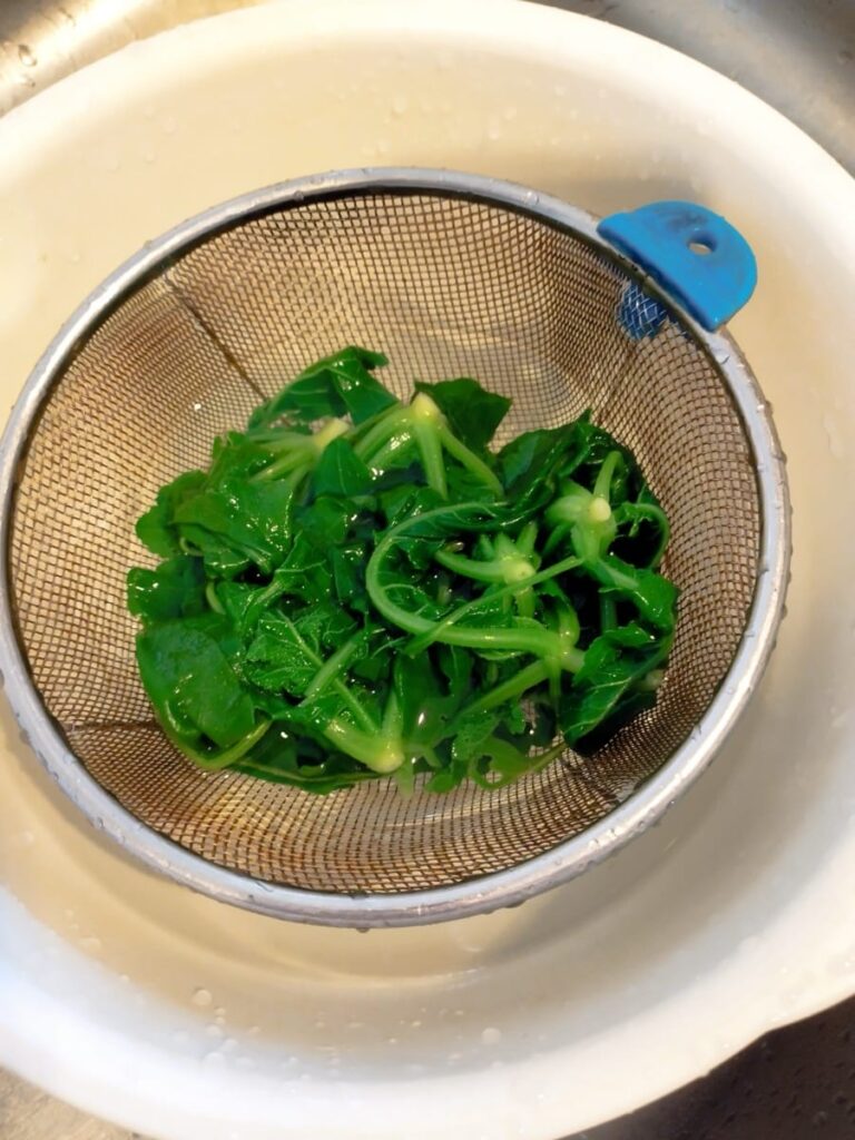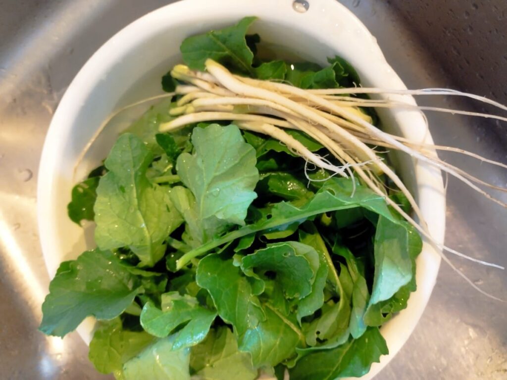 根を切り分けて、根を先に茹でて後から時間差で葉を茹でる。時間は適当。わたしは2分ほど葉を茹でた。