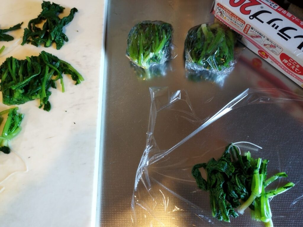 1回目と同じ様に茹でたら、お弁当のおかずのサイズに切って、ラップで包む。